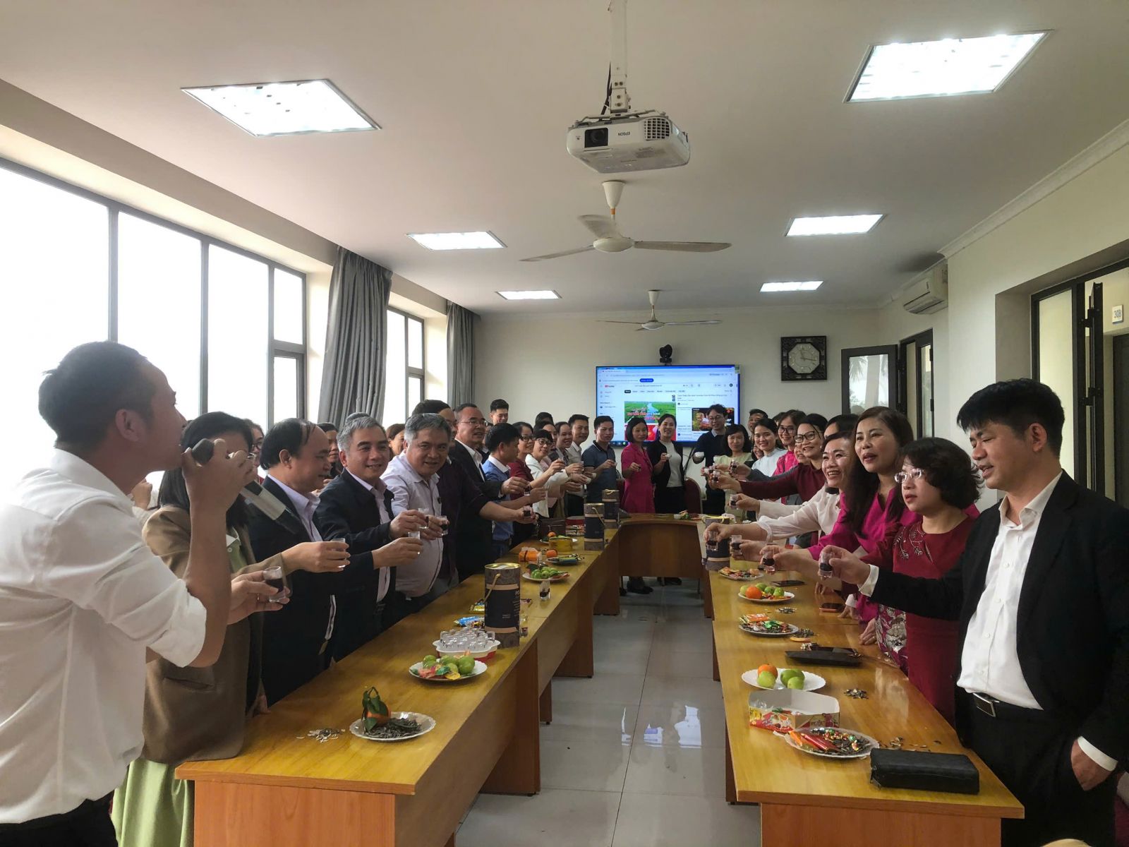Trong không khí sum họp đầm ấm, các cán bộ đã cùng nhau nâng ly chúc mừng năm mới, trao nhau những cái bắt tay, những lời chúc tốt đẹp và không quên những phong bao lì xì cho một năm mới tràn đầy may mắn. phát tài, phát lộc.